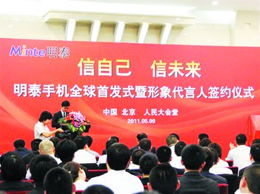 2011年5月9日,明泰手机全球首发式暨西单女孩形象代言签约仪式在人民大会堂隆重开幕。工业和信息化部通信科技委员会常务委员、中国移动通信联合会副会长谢麟振教授,深圳市手机行业协会会长孙文平,来自全国的明泰手机代理商代表以及中央电视台、新华社、人民网、中国网、搜狐网、中关村在线等主流新闻媒体共计200余人,共同见证了明泰手机在全球市场的起航。