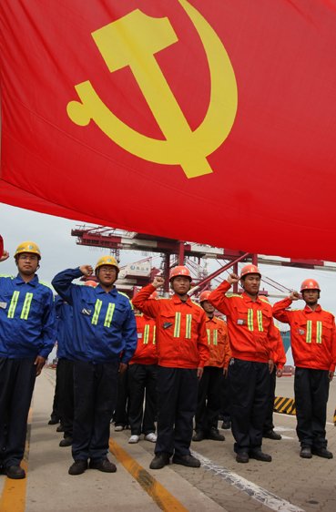 青岛港荣获“全国模范劳动关系和谐企业”称号。图为青岛港职工入党宣誓本报记者林瑞泉/摄