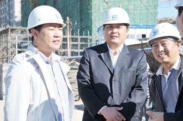 包头中铁房地产开发有限责任公司总经理、党支部副书记尚军(左一)在施工现场