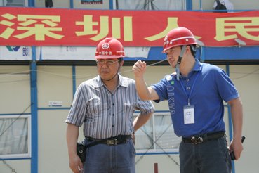 王国庆(右)向检查项目工作的公司领导汇报工作