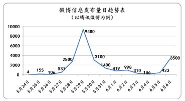 从图表中我们可以看出,在湛江钢铁项目获批后的两周内,相关新闻报道及转载量呈上下波动的发展趋势,在多个日期均出现了转载高潮;而在微博自媒体方(以腾讯微博为例),信息发布量则于5月28日至6月2日期间集中爆发,并于5月29日达到9400条的最高值。这主要与“湛江市市长王中丙发改委门外亲吻文件庆祝”的相关新闻于5月28日发布后引来媒体与公众聚焦关注有关;同时,“除湛江项目外发改委还核准了一批投资额过千亿钢铁项目”的消息亦助推了舆论浪潮的扩大,直至“发改委否认‘4万亿’重来,称‘新一轮经济刺激计划’是误解”的报道传出,舆论热度仍然不减。