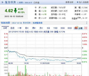 从2010年9月登陆创业板的东方日升,截至2012年9月26日的短短两年间,公司股价从42元一路跌至4.61元,跌幅高达91%。伴随股价下跌的是,《中国企业报》记者看到,上市以来公司营收和利润持续下滑:2011年营业收入同比下降11.31%、营业利润同比下降82.22%。2012年上半年,公司营收比上年同期下降37.46%,营业利润同期下降102.81%、亏损287.5万元。