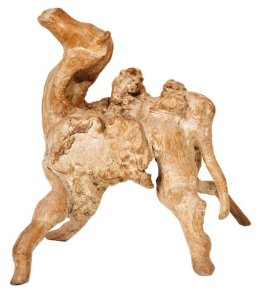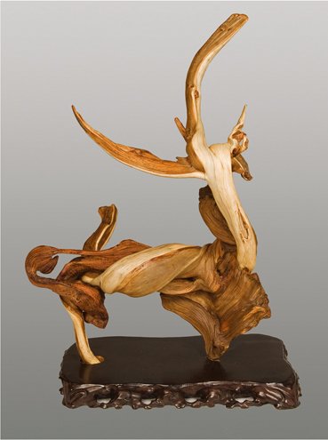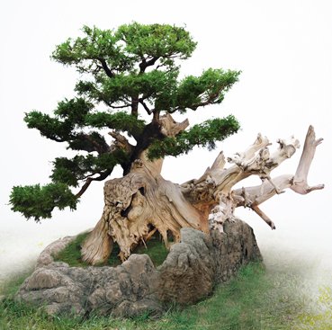 2、半枯朽树桩移栽培育天美艺术。此类半枯朽树桩在野生状态下已受到严重侵害,生命垂危,恶性循环,对此类野生树桩采用浅采短根技术进行抢救性采挖,施以科学手段移栽成活后加以培育整形,亦可成为高档艺术品,再配以合适的用原生态山石加工的盆钵,其效果登峰造极,如此对树桩本身,就像唐僧历经九九八十一难后修成正果,对环境损害最轻,对创作者来讲堪称为善举。现在盆景界中也流行模仿大自然造型,以去皮和“丝雕”等手段去追求野生枯朽树桩枯朽面的艺术效果,然而天工与人工毕竟差距太大,明眼人一看便知终究是“赝品”,其观感和艺术效果以及市场价值,绝不能同日而语。