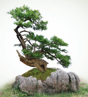 4、枯朽树桩在移栽新根长成后,像危重病人痊愈出院一样,即可在常规护理下生长造型,但仍需提供优越的条件,让其住进“疗养院”。待完全成型后再采用原生石凿坑栽植,二者格调非常接近,珠联璧合,可突出其高古、卓尔不群的气质,如按常规用紫砂盆栽植,则会大大减色,这也是此种作品高于和区别于普通盆栽之处。