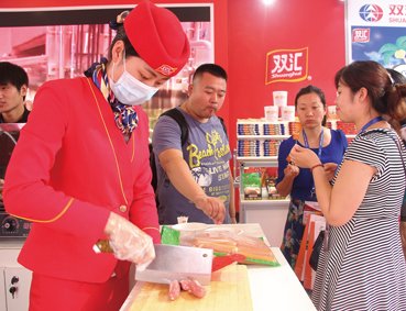 记者在会场看到,双汇发展参展产品众多,主要设有高、低温食品等多个展示区,展出了高温火腿、高温灌肠、西式火腿、低温灌肠、冷冻罐头等多个系列产品,让现场消费者目不暇接。