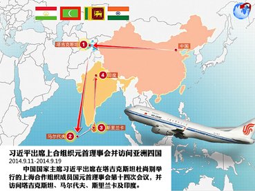 2014年9月11日—19日,国家主席习近平应邀赴杜尚别出席上海合作组织成员国元首理事会第十四次会议,并对塔吉克斯坦、马尔代夫、斯里兰卡、印度进行国事访问。期间与四国领导人致力于推进关于经贸、金融、基础设施建设以及教育等多方面的合作,并签署多项合作协议。