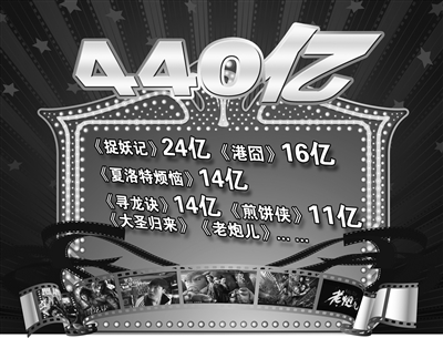 2016年1月2日,“人民电视”以“播出440亿”的好消息贺岁。明眼人立刻抓住“2015年国产影片票房271.36亿元,占总票房的61.58%。《捉妖记》24亿、《港囧》16亿、《夏洛特烦恼》14亿、《寻龙诀》14亿、《煎饼侠》11亿”的数据,对《中国企业报》记者表示了自己的观点:“较大优势保持了国产电影在中国电影市场的主导地位”。