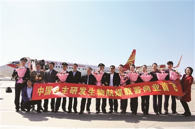 镇海炼化生产的生物航煤以餐饮废油、棕榈油为原料,应用中国石化自主研发的技术,2015年3月21日,成功实现载客商业首飞。