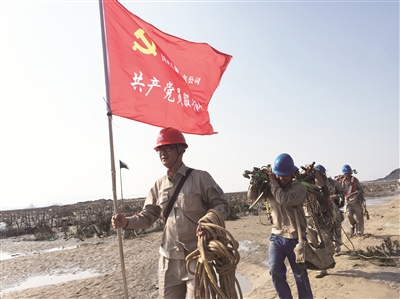| 在抗击“莫兰蒂”台风中,国网石狮市供电公司共产党员服务队赴厦门大嶝岛支援抢修复电。 胡玲/摄 |