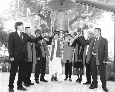 ①华津董事长杨乔华(中)带领管理团队在新三板上市敲钟