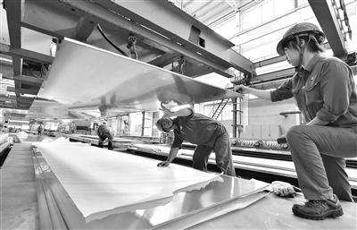 | 西南铝员工在生产线上检查即将出口乌克兰的铝合金厚板表面质量 |