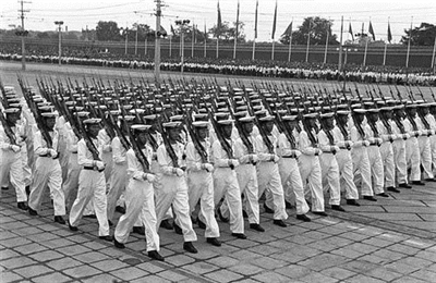 10时整,建国十周年国庆典礼开始。受阅官兵身着在五五式服装基础上加以改进的新式服装,显得更加威武精神。