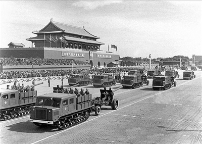 1959年国庆十周年阅兵式,受阅部队官兵身着新式军服,佩戴军衔。军事学院方队、水兵方队、步兵方队、空降兵方队依次受阅,喷气式轰炸机和歼击机从扩建一新的天安门广场上空飞过。 这次阅兵与五周年国庆阅兵相比,取消了三轮摩托车方队、士兵船形帽方阵。受阅武器装备国产化程度大大提高,其中我国自行制造的“五九式”主战坦克和“红旗牌”检阅车首次亮相国庆阅兵式。