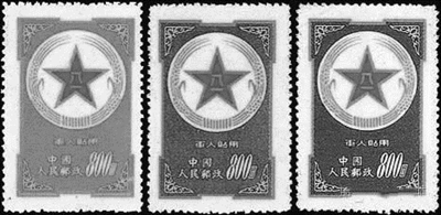 1953年2月为了优待军人寄信,邮电部发行一套“军人贴用”邮票,邮票共3枚,面值均为旧人民币800元,图案为中国人民解放军“八一”军徽,军徽下面印有“军人贴用”、“中国人民邮政”、“800元”字样。第一枚底纹为橘红色,俗称“黄军邮”。