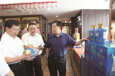| 茅台酱香酒公司董事长李明灿(右一)到经销商专卖店指导“建网络、抓陈列、搞品鉴”三大工程 |