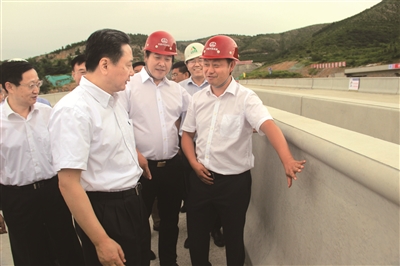 | 张军元(右一)向交通运输部部长、党组副书记李小鹏(左二)现场汇报工程情况 |