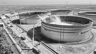 演练按照既定科目开展,8时40分,一阵急促的警报声在该站生活区响起,老站3#大门有四名不法分子非法闯入站库,站库启动安保防恐应急预案,使用一键报警并对现场进行处置,站库员工、安保力量,配合榆庆公安分局,对闯入的暴恐分子进行围堵并成功抓获。8时45分,运行库10万方储罐4#罐西侧可燃气体报警仪显示油气浓度超标,当班巡检员工到达现场查看后发现,4#储油罐出口阀门法兰发生油气泄漏,在处置过程中,不法分子利用高科技手段操控无人机投掷燃烧物将4#储罐泄漏的原油点着并引发大火。发现火情后,现场人员立即报告值班干部启动应急预案并启用消防泵操作。站控人员通过消防自控系统远程启动4#罐喷淋系统,对4#储油罐进行冷却。