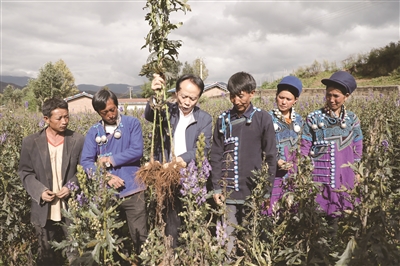 | 耿福能亲自到田间地里指导彝族群众种植中药材 |