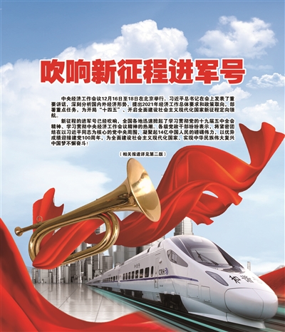新征程的进军号已经吹响,全国各地迅速掀起了学习贯彻党的十九届五中全会精神、学习贯彻中央经济工作会议精神的热潮。各级党政干部纷纷表示,做好明年的经济工作任务十分繁重,全党要紧密团结在以习近平同志为核心的党中央周围,凝聚起14亿中国人民的磅礴伟力,以优异成绩迎接建党100周年,为全面建设社会主义现代化国家、实现中华民族伟大复兴中国梦不懈奋斗! (相关报道详见第二版)