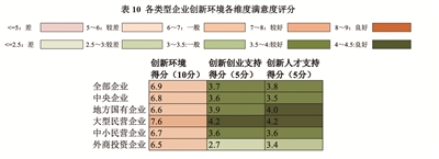 企业对于创新环境的总体评价一般,评分为6.9分,但是大型民营企业对于创新环境的评价较好,评分为7.6分(见表10)。具体而言,企业对于创新人才支持的评分(3.8分)高于对于创新创业支持的评分(3.7分)。最为显著的即为外商投资企业的评分。外商投资企业对于政府出台的对创新创业的相关支持评价较差,仅为2.7分,但是对于创新人才支持的评分为3.4分。其他企业情况类似,这反映出了国家在人才层面对企业的大力度支持。
