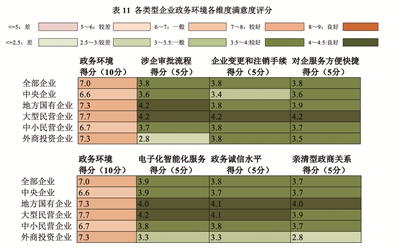 大型民营对于政务环境的总体满意度最高(7.7分),中小民营企业的总体评分较低(6.7分)。外商投资企业对于政务环境的总体评价较好(7.3分),但是对于各项具体维度的评分却较低,特别是对于涉企审批流程与政商关系的评价均较差,低于3分(见表11)。