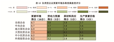 企业对于要素环境的总体评价一般,平均得分为6.7分。其中,外商投资企业对于要素环境的满意度最低,仅为6.2分;中小民营企业对于要素环境的评分同样较低(6.5分)(见表13)。