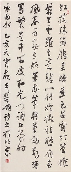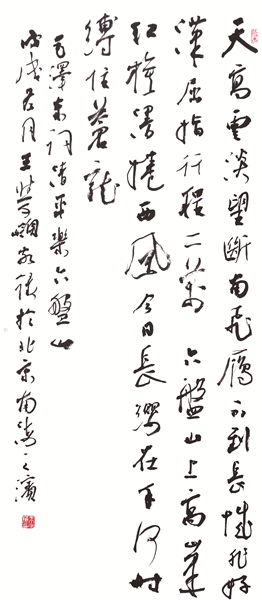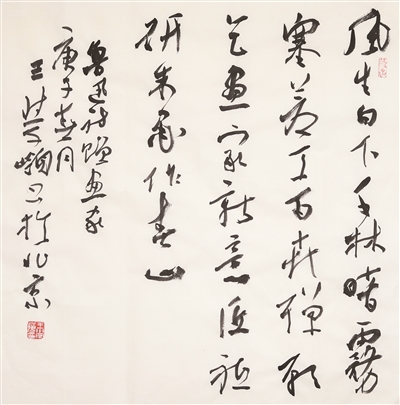 读他的行书,隐约可悟他的所思所为——思《圣教序》端严结构形态,取其古朴简静之境界;思《争座位帖》沉郁顿挫任笔,取其雄浑宏博之神韵;思《吴江垂虹亭作》纵逸攲侧气势,取其劲健挺拔之气格;思《张好好诗》体势姿媚舞动,取其左右呼应点画之委婉。在此基础上,他艺术提炼碑学、帖学元素,举一反三,糅合融变,删繁就简,形成自我语言体系,匠心独运,遂成个貌。