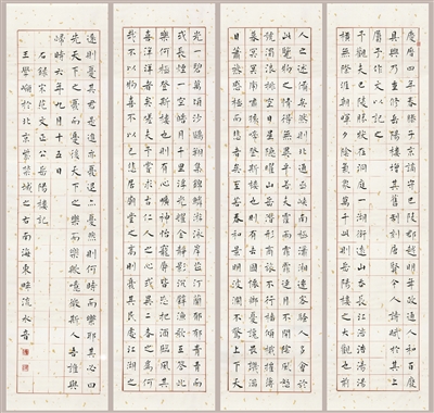 王学岭深谙,碑、帖学互济,绝非形貌混杂,绝非生硬突兀安排,而是自然天成。故其楷书,自然峻拙中寓于平和简静,谨严隽雅中赋予活落清劲;抑或质朴朗秀中见古雅,抑或内舒外敛中见心胸豁达之性情;以及他以行入楷的运笔和用笔的方圆变化,皆打破了楷书的程式感,既获得一种时代的清新意趣,又融变出气格境界的高逸。