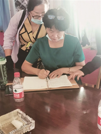 ③村民代表表决全票通过会议决定并签署相关文件(村民代表袁淑萍签字中)